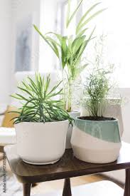Collection of contemporary planters and greenery i...