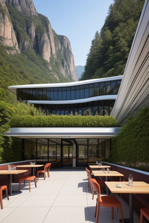Cafe, designed by Zaha Hadid, Post-Modern Architecture, in the morning, in the mountains