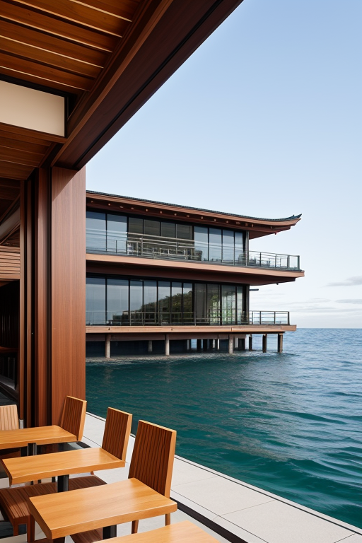 Restaurant, designed by Mies Van der Rohe, Japanese architecture, in the afternoon, in the ocean