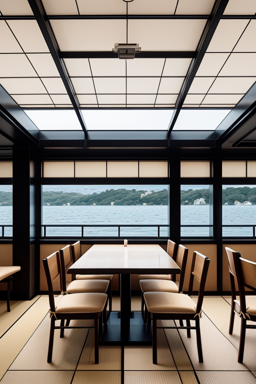 Restaurant, designed by Mies Van der Rohe, Japanese architecture, in the afternoon, in the ocean
