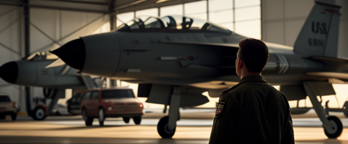 Wide, Afternoon a man is in a air force hangar behind his some air fighter planes