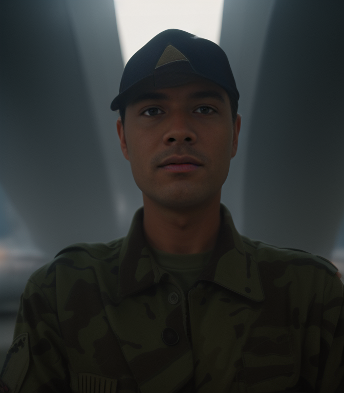 Wide, Afternoon in a air force hangar behind his some air fighter planes