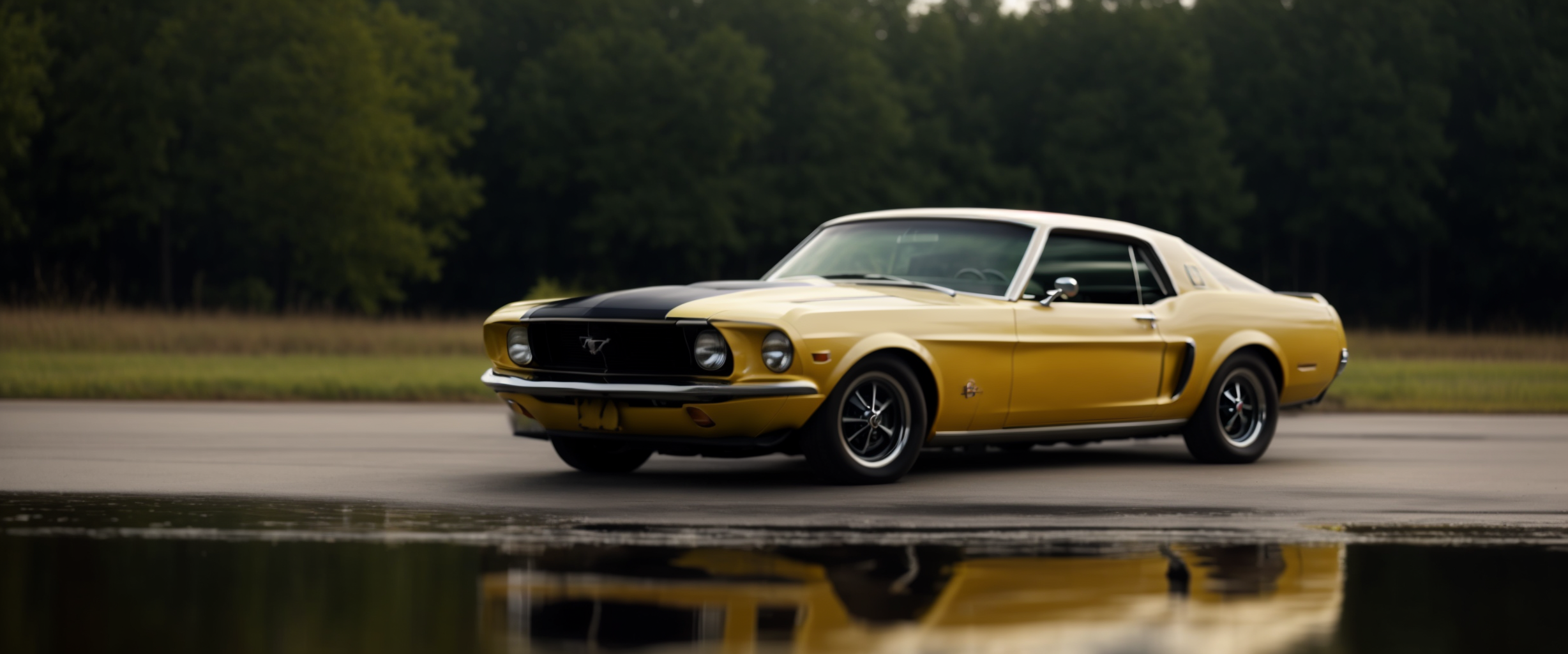mustang 1969 model.pond having reflection of car.  Morning, Wide, Morning