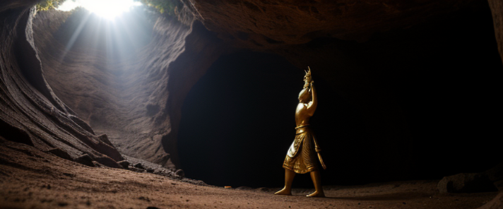 A man walked inside the cave where he saw lord Shiva statue in dancing pose. upright corner ray of sunlight falling on lord Shiva statue. , Wide, Morning