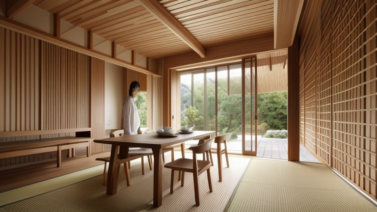 Dining Room, dining table with chairs, Japanese design, serene and minimalist, clean lines, natural materials, wood, stone, neutral colour palette, sliding doors shoji, tatami mats,  Zen garden elements, focus on simplicity and harmony