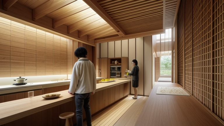Dining Room, dining table with chairs, Japanese design, serene and minimalist, clean lines, natural materials, wood, stone, neutral colour palette, sliding doors shoji, tatami mats,  Zen garden elements, focus on simplicity and harmony, Kitchen