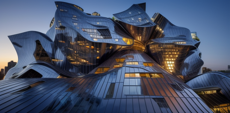 Skyscraper, designed by Frank Gehry, Parametric Architecture, at night, in New York, designed by Zaha Hadid, in the morning