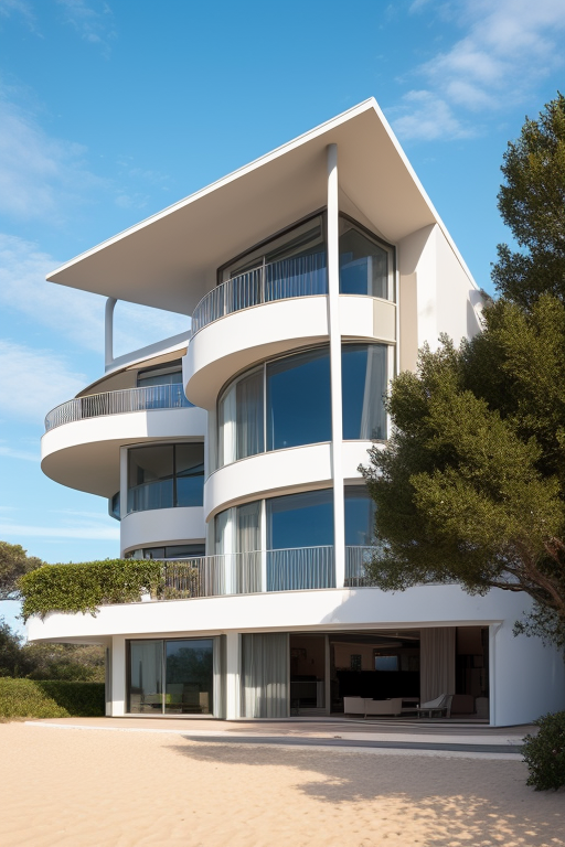Villa, designed by Eero Saarinen, Modern Architecture, in the morning, in the ocean, on the beach, designed by Gaudi, Neofuturist Architecture