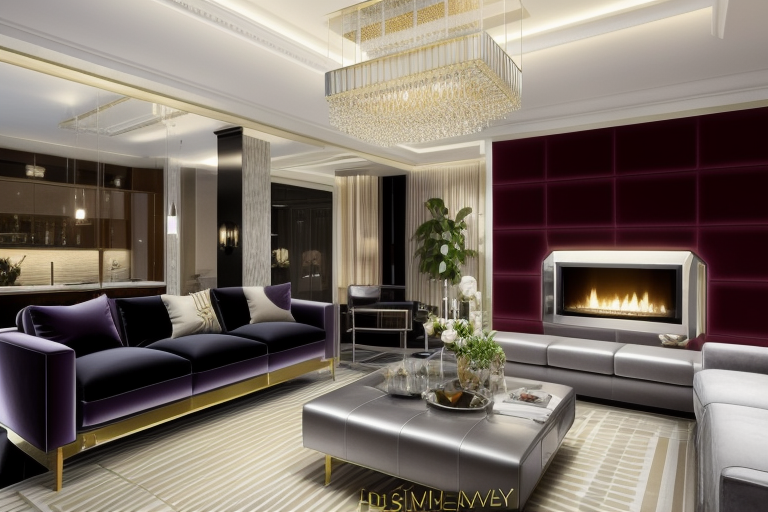 Living room, well arranged livable space, homy, couch, coffee table, armchairs, dining table with chairs, kitchen island, , Hollywood Glam design, glamorous and lavish, bold and luxurious colours, black, silver, mirrored surfaces, velvet and satin fabrics, dramatic atmosphere, indulgence, art-deco inspired