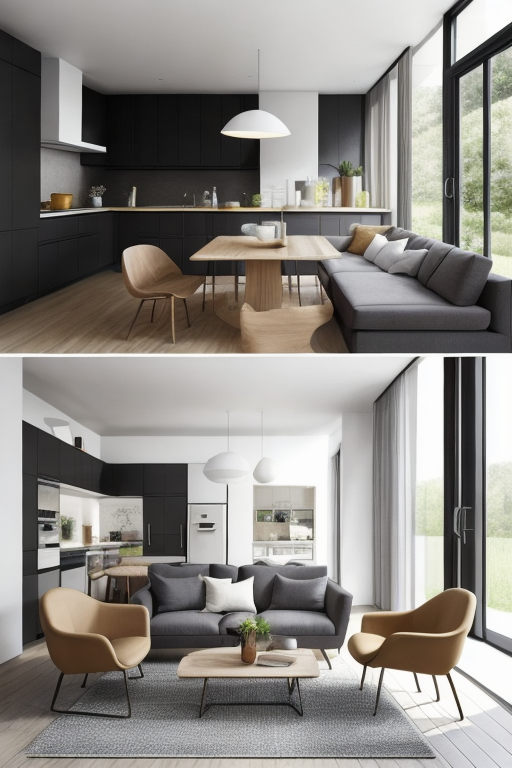 Living room, well arranged livable space, homy, couch, coffee table, armchairs, dining table with chairs, kitchen island, , Contemporary design, clean lines, minimalist aesthetic, functionality, open uncluttered spaces, neutral colour palette