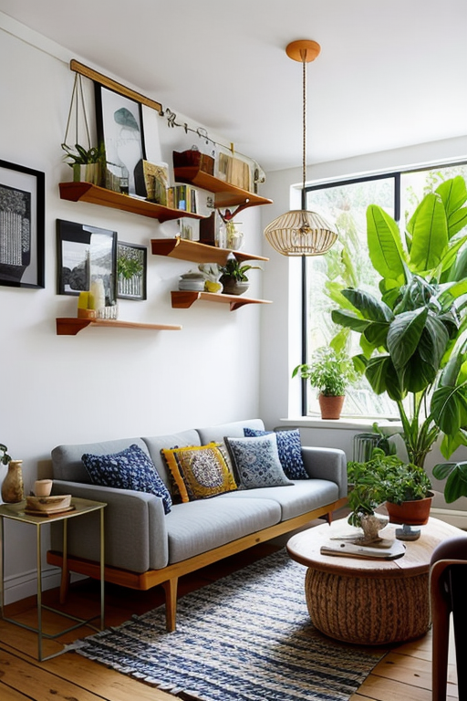 Living room, well arranged livable space, homy, couch, coffee table, armchairs, dining table with chairs, kitchen island, , Bohemian design, electric and free-spirited, mix of patterns and colours, relaxed look, natural materials, vintage and human made elements