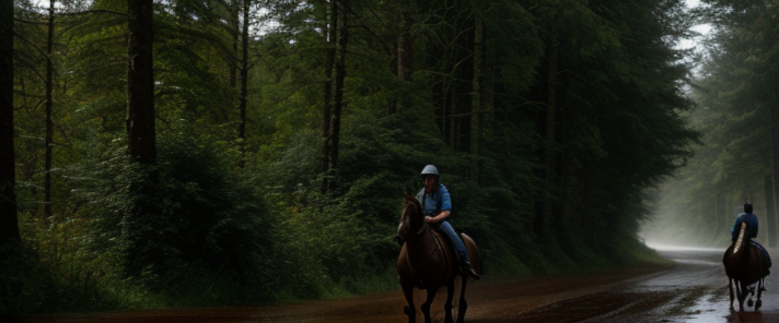 WOMEN RIDING HORSE IN MID RAINY FOREST , Wide, Morning