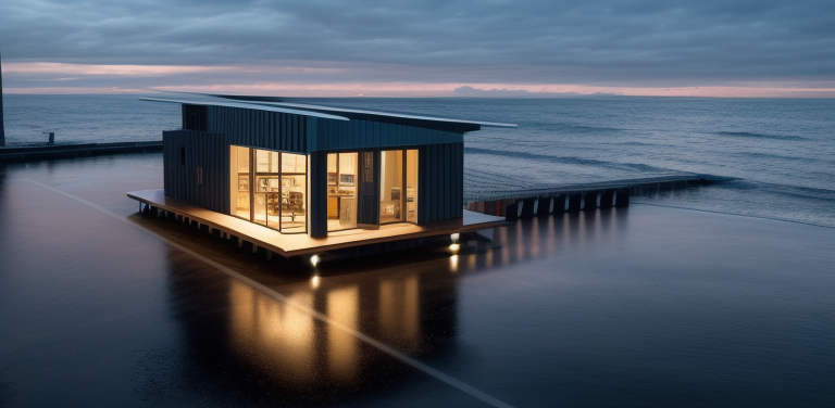 Bar, designed by Alvar Aalto, Japandi architecture, in the morning, in the ocean