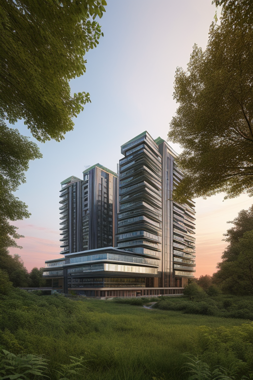 Modern green building concept, High Rise, designed by Zaha Hadid, Modern Architecture, at sunset, in the forest