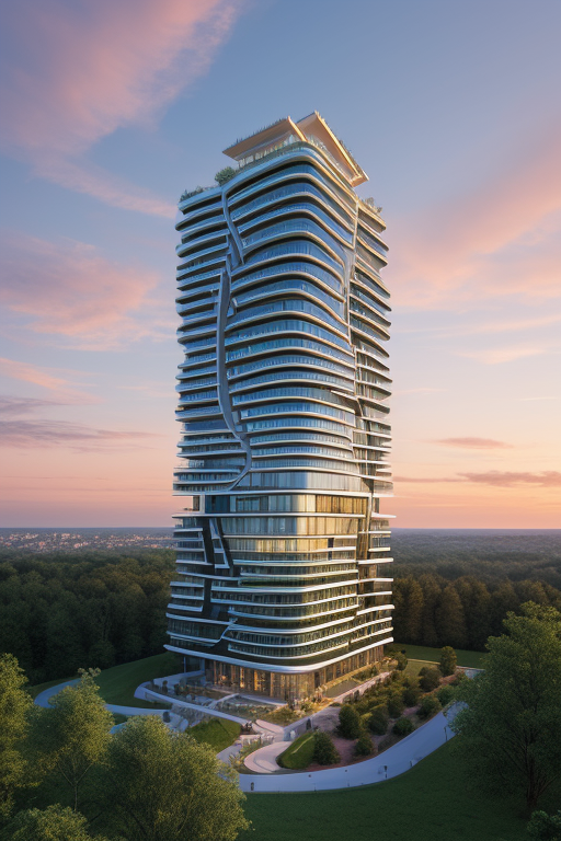 Modern green building concept, High Rise, designed by Zaha Hadid, Modern Architecture, at sunset, in the forest
