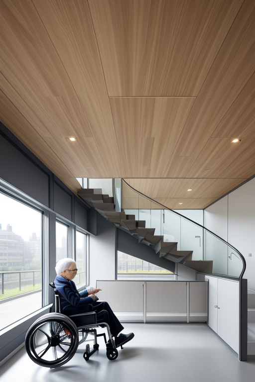 a smart, small and modern wheelchair station for old people, Hospital, designed by Tadao Ando, in the morning, in London,