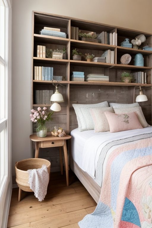 To replicate this look in your own home, focus on a neutral color scheme with accents in muted pastels to maintain tranquility. Investing in a substantial wooden bookcase or headboard with clean lines can transform your sleeping area into a personal sanctuary while maximizing space efficiency. Local craft markets or woodworkers may offer bespoke furniture pieces that can infuse your room with a rustic charm akin to the headboard featured here. For textiles, look for quilted blankets and plush pillows at home decor stores, such as West Elm or Pottery Barn, to recreate the indulgent comfort without overwhelming the simplicity of the room's aesthetic. Adding a few well-chosen accessories, such as glass vases or ceramic knick-knacks, can be sourced from thrift stores or specialty boutiques to complete the personalized touch of your restful retreat. Remember, the key to this look is balancing rich wooden textures with soft fabrics and keeping decorative elements charming yet understated.