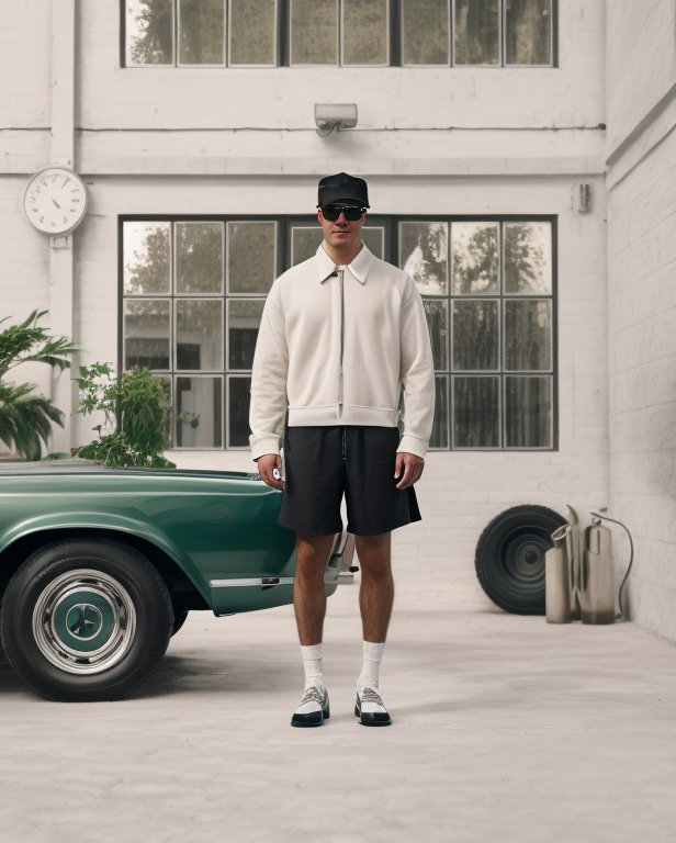 The image depicts a space where industrial charm meets minimalist sensibility, creating an atmosphere that's both expansive and intimate. The large, multipaned windows allow natural light to flood the room, highlighting the whitebrick walls and polished concrete floor. This foundational simplicity is juxtaposed with the gorgeous vintage car, lending character and a touch of luxury. A sense of balance is evident in the clean lines, uncluttered surfaces, and the restraint shown in decor, adhering to the 'less is more' principle. The indoor plant adds a fresh organic touch to the otherwise monochrome palette, illustrating that greenery can soften and enliven an industrial setting.