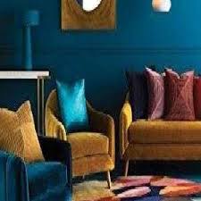 To recreate this look in your own home, start with a muted color palette for the walls like a soft grey, which can serve as a versatile foundation for bolder furniture choices. High street retailers or mid-range furniture brands often carry pieces in the vibrant tones featured here. To emulate the luxurious feel of the seating, search for plush armchairs and couches in standout hues of blue or yellow; these can often be found in stores that offer contemporary furnishings. Introduce texture with accent pillows and a soft rug. Finally, accent your space with a mix of classic and modern lighting fixtures similar to the sconettes and chandelier from specialty lighting stores or online marketplaces. With the right balance of old and new, you can create a space that is both stylish and functional.