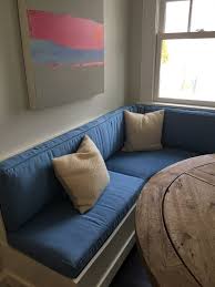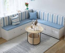The inviting kitchen space shown in the image is a harmonious blend of traditional design elements with a fresh and contemporary finish. The balanced use of coastal blue cabinetry set against crisp white walls creates a serene and open ambiance that is both welcoming and stylish. The cabinetry isn't just a color statement; it encompasses detailed paneling that adds depth and character to the space. Natural light filters through the window, softly diffused by warm, textured bamboo shades, to enhance the sense of calm. A built-in window seat, upholstered in a complementary blue fabric, offers a cozy nook for relaxation or casual dining, while the wooden floor maintains an organic flow, tying the indoor environment to the natural world outside.