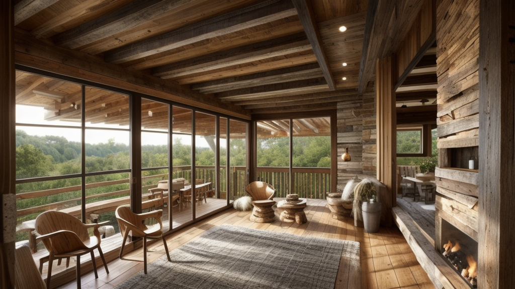 Stepping into this space, one is immediately struck by the harmony of natural elements and the seamless flow of indoor-outdoor living. The use of wood is predominant, lending warmth and organic beauty to the area—a testament to rustic sophistication. Exposed beams across the ceiling create architectural interest, while the large glass windows provide a canvas for the breathtaking, verdant panorama beyond. This synergy of structure and scenery, paired with the cozy fireplace nestled in stone, orchestrates an inviting ambiance. Strategically placed lighting accents the room's texture, enhancing the interplay of shadows and depth, which is key to crafting an engaging interior.