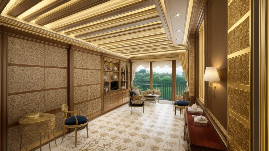 The interior space in the image provided presents a harmonious blend of elegance and symmetry, clearly inspired by neoclassical design principles. This room boasts a refined color palette that anchors the space, with shades of gold, cream, and deep blue adding richness and warmth. Notice how the high ceilings are utilized to create a sense of grandeur, accentuated by the intricate coving and bold, gilded cornices that draw the eye upward. The wall panels, adorned with ornamental motifs, not only add texture and depth but also echo the timeless beauty of European aristocratic homes. The furniture selection maintains the stately theme, with luxurious fabrics and finishes on the chairs complementing the surrounding patterns and hues. Functionality isn't sacrificed for form; the built-in bookshelves and wisely placed lighting ensure that practicality goes hand in hand with aesthetics.