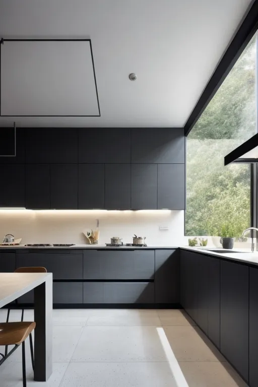 The striking image presented is a masterclass in modern kitchen design, showcasing a harmonious blend of clean lines, understated color palettes, and an infusion of natural light. The design features sleek, matte-black cabinetry providing a bold contrast against the crisp white walls and ceiling. These elements are seamlessly integrated with state-of-the-art appliances, enhancing the room's functionality while maintaining aesthetic minimalism. A distinct feature is the under-cabinet lighting, casting a warm, diffused glow on the countertops, further accentuating the monochromatic scheme. An angled window introduces an architectural interest, opening the space to the outdoor landscape and serving as a natural focal point that balances the interior's geometric precision. This thoughtful interplay of light and form underpins the space's allure, creating an inviting yet highly functional environment.