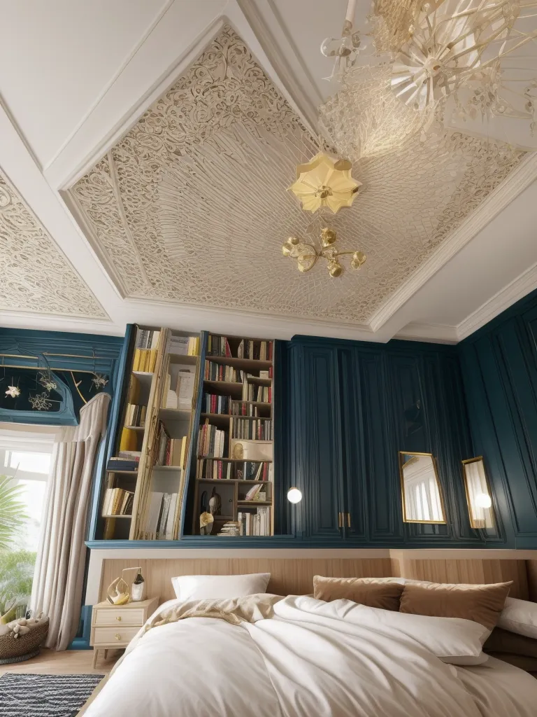 Upon entering this gracefully designed room, one's gaze is immediately drawn aloft to the intricately patterned ceiling that exudes classic elegance. The luxurious texture of the ceiling provides an aesthetic counterpoint to the imposing dark teal, paneled walls - a bold choice that creates depth and a sense of sophistication. The built-in bookshelf, brimming with books and personal artifacts, injects personality and warmth into the space, while the slim, elegant lines of the furniture add a contemporary touch. Accent lighting, strategically placed to highlight the room's high points without being obtrusive, turns attention to the stunning chandelier which acts simultaneously as a light source and a sculptural focal point.