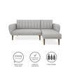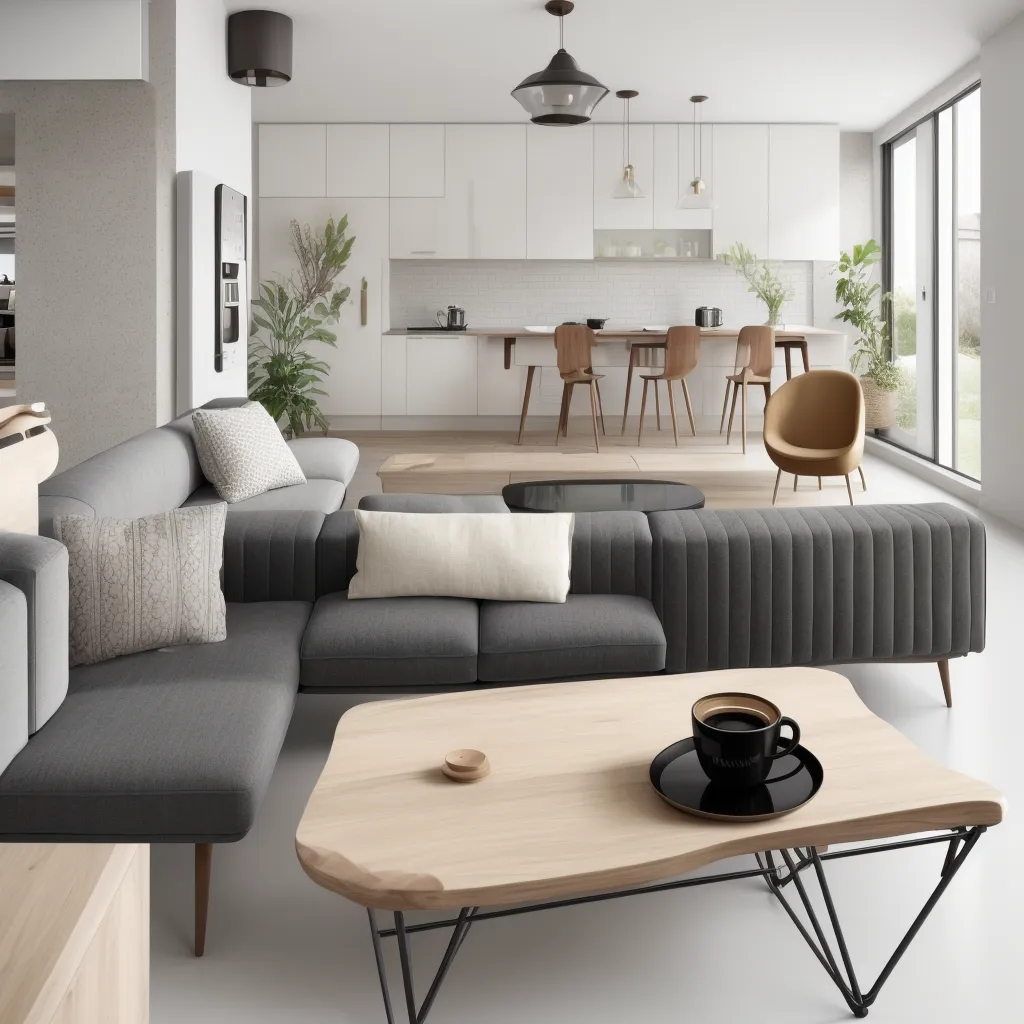 The elegant interior depicted seamlessly blends minimalist charm with cozy sophistication. A monochromatic color palette enhances the room's cohesive feel, anchored by inviting shades of gray on the plush sofa. The textural variety from the throw pillows to the ribbed detail on the sofa adds a tactile dimension, creating an engaging yet tranquil space. The modern kitchen in the backdrop with its clean-lined cabinetry and soft wood tones extends the serene ambiance, while contemporary pendant lighting fixtures add a dash of industrial edge. Natural light floods in through large windows, suggesting an intentional design to bridge indoor comfort with outdoor expansiveness.