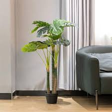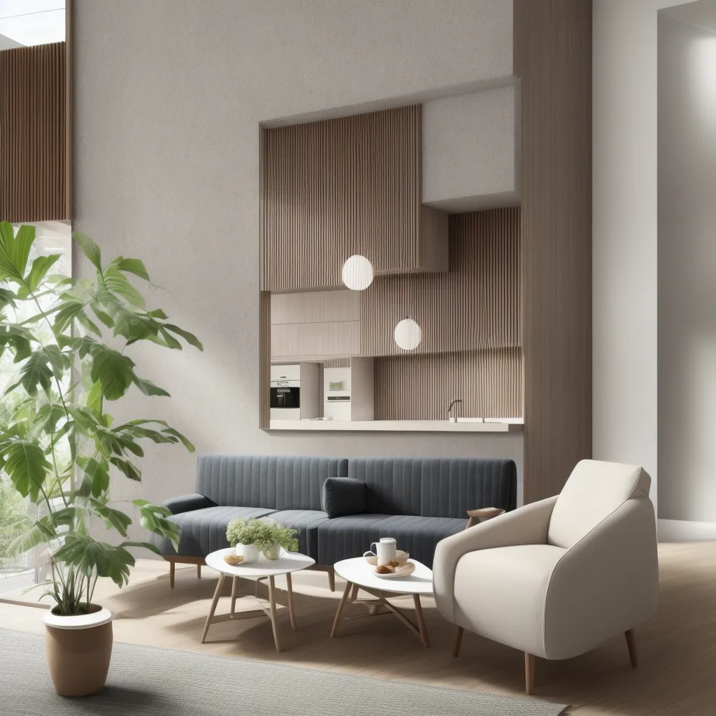 The essence of modern interior design is captured in this serene space, where simplicity and sophistication harmonize. The minimalist approach to design is evident in the smooth, clean lines and a neutral color palette consisting of tans, beiges, and grays that create a sense of calm and spaciousness. Texture plays a key role here; the ribbed wooden detailing on the cabinetry adds depth and a tactile quality that contrasts beautifully against the matte walls. Mid-century modern touches are present in the furniture selection—the sleek, navy blue sofa with tailored lines, along with the wooden, splayed-leg coffee tables, and the understated yet elegant armchair. The subtly-patterned rug anchors the seating area, while lush greenery introduces vibrancy and a connection to the outdoors.