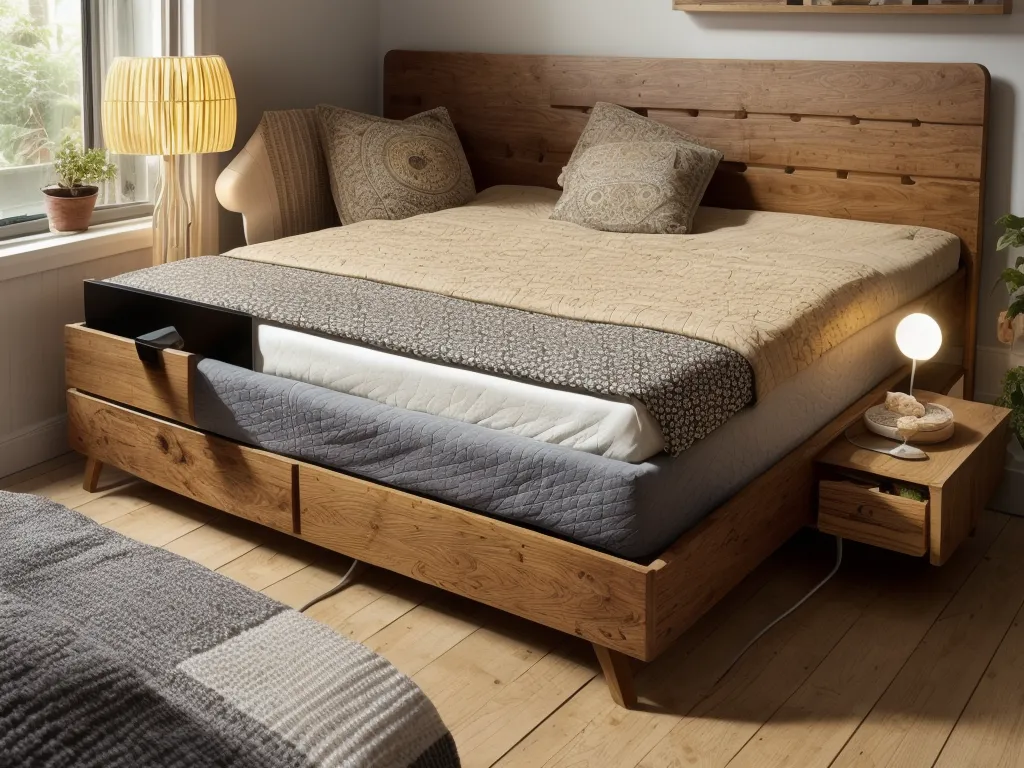 The interior design presented in this serene bedroom scene leans heavily into a sense of organic warmth and functional minimalism. Anchoring the space is a robust, wooden platform bed that brings a sense of solidity and earthiness to the room. Its built-in storage drawers add a practical touch, demonstrating an excellent use of space that is both aesthetic and functional. Textural contrast is found in the layering of bedding with a mix of patterns and solid hues, offering visual interest without overwhelming the senses. The bedside tables, in a matching wood tone, maintain the room's cohesive natural palette, while the simple yet elegant lighting choices—a table lamp with a pleated shade and a spherical bedside lamp—provide a soft, ambient glow enhancing the tranquil atmosphere.