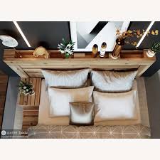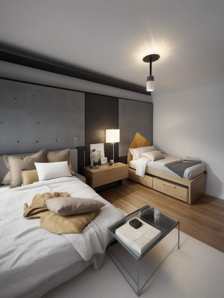 Unlocking the serene elegance of minimalist design, this bedroom interior merges clean lines with warm, natural tones to create a tranquil sanctuary. The harmonious balance is achieved through a mix of textures and materials, notably the juxtaposition of the concrete wall with the plush bedding and smooth wooden furniture. This contrast between industrial and natural elements is a hallmark of contemporary design, offering both visual interest and a comforting atmosphere. Ambient lighting from the sleek ceiling fixture enhances the room's modern aesthetic while soft accent pillows introduce a cozy touch.