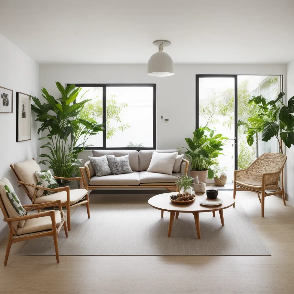 The serene living space seamlessly blends natural elements with modern design, evoking a sense of calm and simplicity. At first glance, the room balances a neutral color palette with earthy wood tones and vibrant greens from the indoor plants, creating a cohesive and inviting environment. The central seating arrangement, featuring a contemporary sofa flanked by stylish wooden armchairs, serves as the focal point—compounded by the round coffee table that anchors the space. Strategically placed wall art adds a personal touch without overwhelming the surroundings, while the ample natural light streaming through the large windows enhances the room's airy feel. The subtle use of texture, seen in the area rug and throw pillows, adds depth to the design, and the minimalist lighting fixture contributes to the overall uncluttered aesthetic.