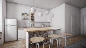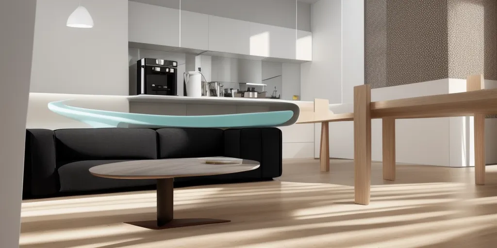 The heart of this interior’s charm lies in its elegant simplicity and the harmonious balance of color and form. A neutral palette serves as the backdrop, ensuring that the space feels both expansive and serene. Crisp white kitchen cabinetry blends with the walls, achieving a seamless aesthetic that promotes a sense of continuity. Natural wood accents, seen in the robust table and sleek round coffee table, infuse warmth into the scheme; these pieces stand out without overwhelming the space, creating focal points that draw the eye. The deep black sofa anchors the living area with its substantial form, offering a visual and tactile contrast to the otherwise light tones. Soft light filters through the window, casting dynamic shadows that enliven the minimalist setting. This interplay of light and texture is a subtle yet powerful tool that adds depth to the room without the need for excessive decor.