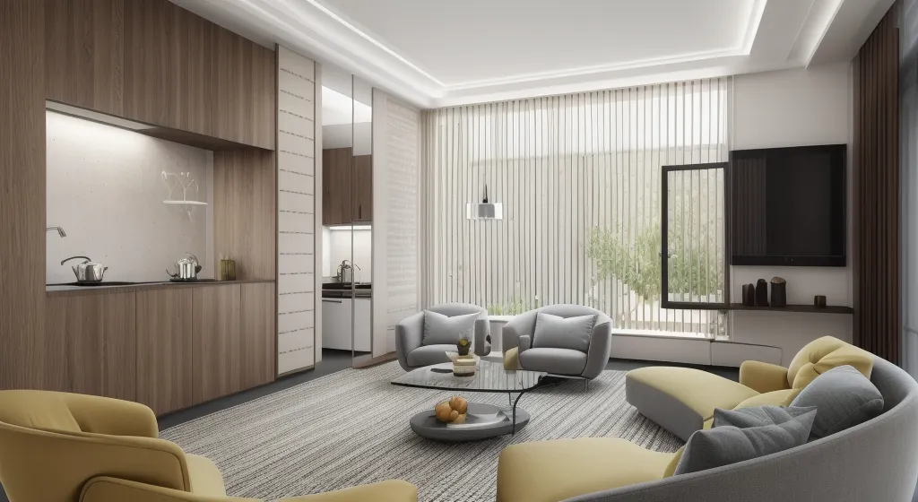 The interiorscape captured here exudes a harmonious blend of modern sophistication and comforting minimalism. Anchored by a soft, neutral color palette, the setting is punctuated by the warm wood tones of the cabinetry and the luxurious pop of mustard in the accent chairs, which inject a cheerful energy into the space. The furniture selection embraces clean lines and soft curves, creating a visual flow that encourages relaxation and conversation. Natural light filters in through the sheer window treatments, lending an airy and open atmosphere, while the strategic use of recessed and pendant lighting adds a layer of warmth and highlights the room's subtle textural elements. Symmetry is artfully balanced with asymmetry in the placement of the television and shelf decor, giving the room a sense of order without rigidity.