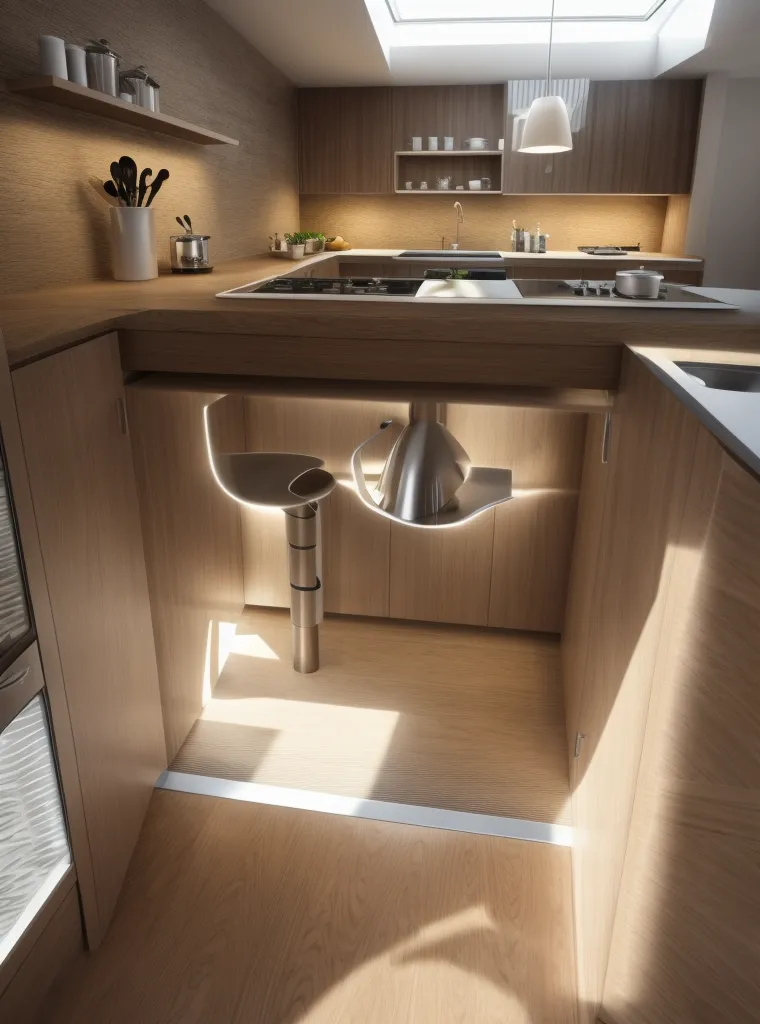 For those looking to replicate this look, begin with selecting a uniform wood finish for cabinetry and flooring to achieve that seamless transition. Brands like IKEA offer a range of kitchen cabinetry that can be customized to fit a variety of spaces, and their options often include light wood finishes similar to those pictured. Incorporate LED strip lights under cabinets for a practical yet atmospheric touch; these can be found at home improvement stores like Home Depot. To keep the design minimal and modern, opt for hardware with clean lines, which are readily available in both big-box stores and specialized kitchen design shops. The key is consistency and restraint—choose elements that speak to a theme of simplicity and elegance, and always keep functionality at the forefront of design decisions.