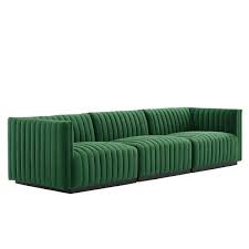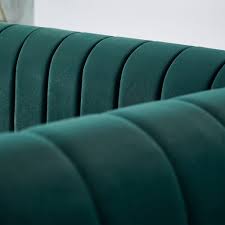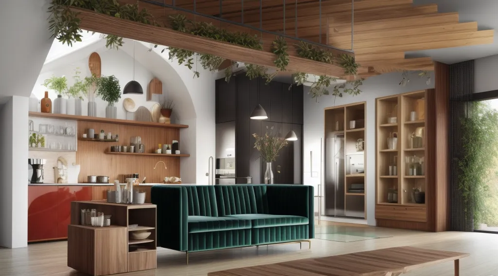 Nestled within this contemporary space is a harmonious blend of raw textures and cozy accents. At the heart of this interior lies an elegant balance between the warm wooden tones of the cabinetry and shelving, and the cool, sleek lines of modern appliances. The bold, emerald green velvet sofa infuses a sublime splash of color, energizing the neutral palette, while overhead, the rustic charm of suspended wooden beams adorned with greenery adds a vertical dimension, bringing a sense of nature indoors. The strategic placement of open shelving facilitates an airy feel, showcasing a curated selection of ceramic ware that champions both function and aesthetic.