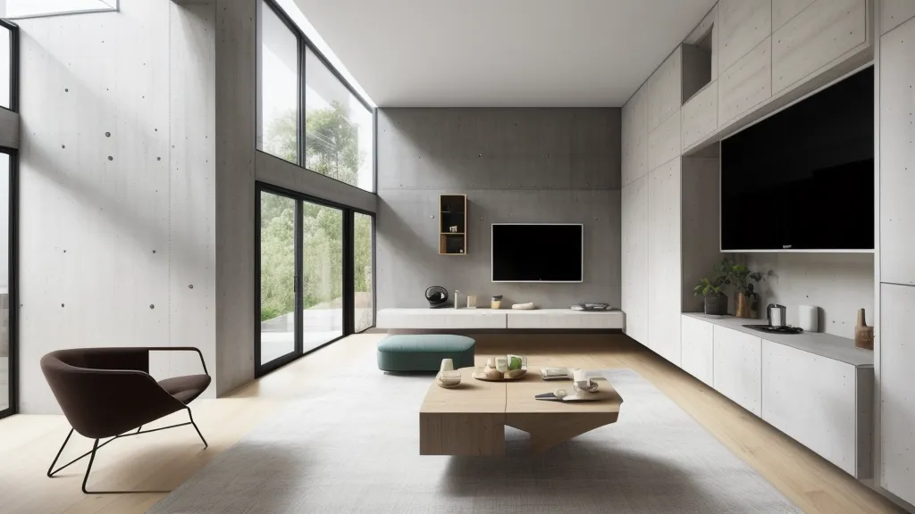 The interior featured here exemplifies the minimalist approach, where each element is carefully considered to create a harmonious and functional space. Stark, clean lines of the exposed concrete walls give it an industrial edge, softened by the warmth of the wooden flooring and complementary furniture. The space is awash with natural light pouring in from the floor-to-ceiling windows, creating a seamless transition between the interior and the serene greenery outside. The strategic placement of furniture, with its understated yet sophisticated design, and the subtle integration of technology maintain the room's sleek appearance without sacrificing comfort or functionality.